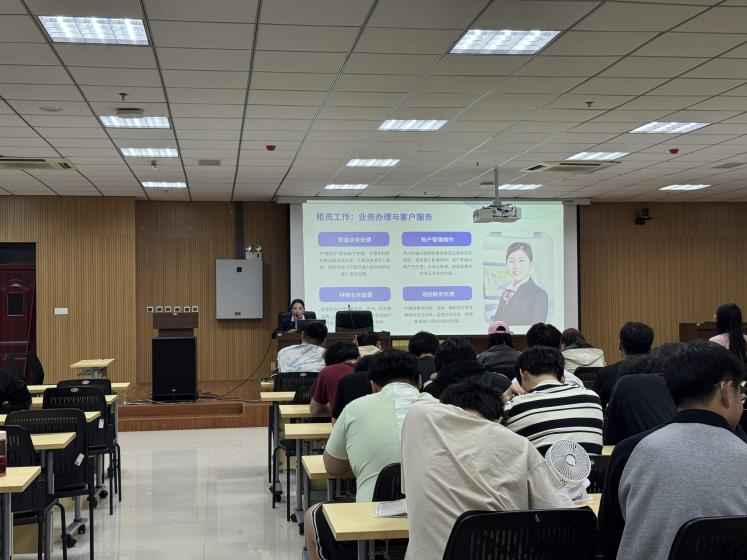 4月17日晚,实践见习理论课程在经管院M112开讲。学院2014级金融工程校友、中国银行安庆分行理财经理余翠翠返校,中国银行孝肃路支行王行长应邀一同出席,共为同学们带来银行从业实务与金融安全专题分享。余翠翠结合自身职业成长经历,围绕银行求职要点、一线岗位工作规范、主流理财产品解析等内容展开讲解,并结合典型校园案例,普及电信诈骗防范、反洗钱等金融安全知识,内容贴近学生实际,实用性强。王行长立足分行运营实践,深入解读当前金融行业发展趋势,现场细致解答同学们在职业规划、行业选择等方面的疑问,为大家提供了务实且专业的参考。