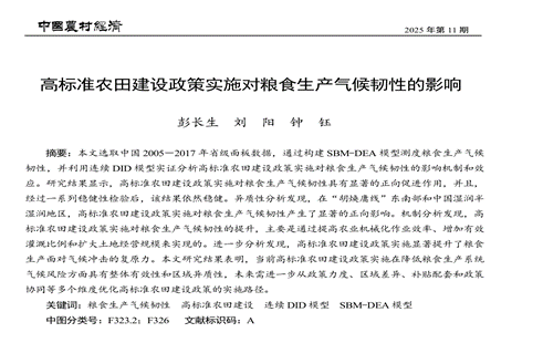 近日,我院彭长生教授、2023级统计学研究生刘阳和中国农科院农经所钟钰研究员,在国内农村经济研究领域顶尖期刊《中国农村经济》2025年第11期发表学术论文《高标准农田建设政策实施对粮食生产气候韧性的影响》,这是彭长生教授第二次在该期刊发表论文,也是2018年经管学院与中国农科院农经所签订战略合作协议,开展中国粮食发展问题合作研究的最新成果。