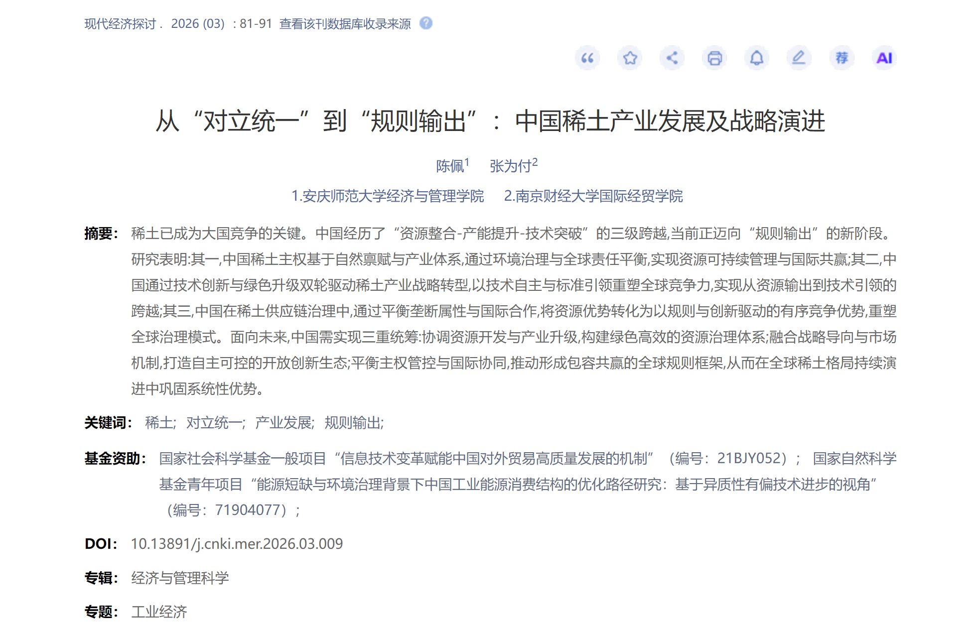近日,国际经济与贸易教研室陈佩博士为第一作者的论文《从“对立统一”到“规则输出”:中国稀土产业发展及战略演进》刊发于《现代经济探讨》2026年第三期。《现代经济探讨》系中文社会科学引文索引(CSSCI)来源期刊,全国中文核心期刊,2025年综合影响因子为4.808。
