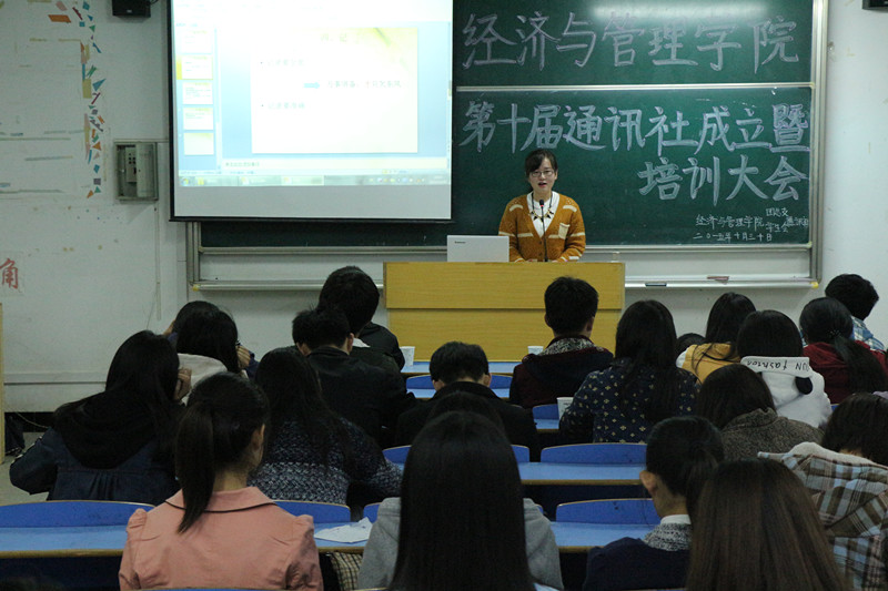 10月30日晚,在文溯楼401教室,经济与管理学院第十届通讯社成立暨培训大会如期举行。应邀本次活动的嘉宾有经管院第九届通讯社社长周颖、第二届记者团团长曹曦、校广播台编辑姜健及校学生会通讯社社长吴义伯。经管院学生会主席杨健及学生会各部部长参加了本次大会。