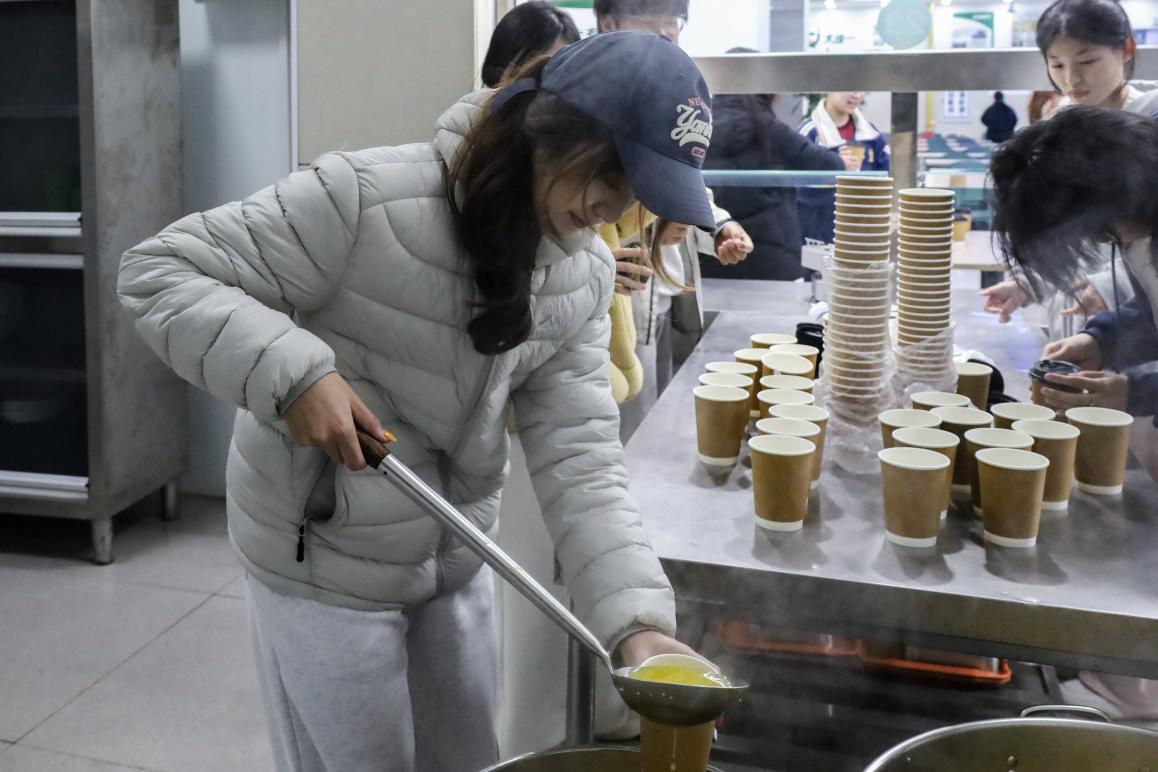 将南瓜洗净、削皮切片,再用搅拌机打碎,随后开火将小米煮至半熟,倒入浓稠的南瓜糊,配上适量白糖,继续熬煮20分钟……一小时后,近百杯香气四溢的暖粥新鲜出锅。工商管理专业2025(1)班的汪奕涵和国际经济与贸易专业2025(1)班的任永琪全程参与制作,此刻正与大家默契配合,将暖粥分装至杯中。