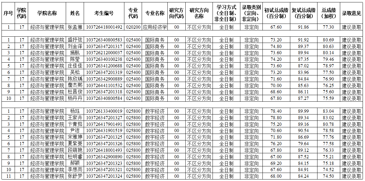 经济与管理学院2026年硕士研究生一志愿复试结果及拟录取名单