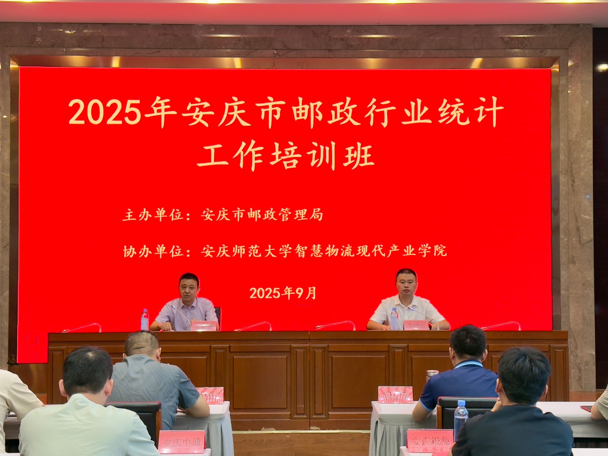 9月18日上午,安庆市邮政管理局召开2025年安庆市邮政行业统计工作培训班,智慧物流现代产业学院参与协办,并安排余卫博士作题为 “邮政业统计制度规范与数据质量提升”的专题报告。